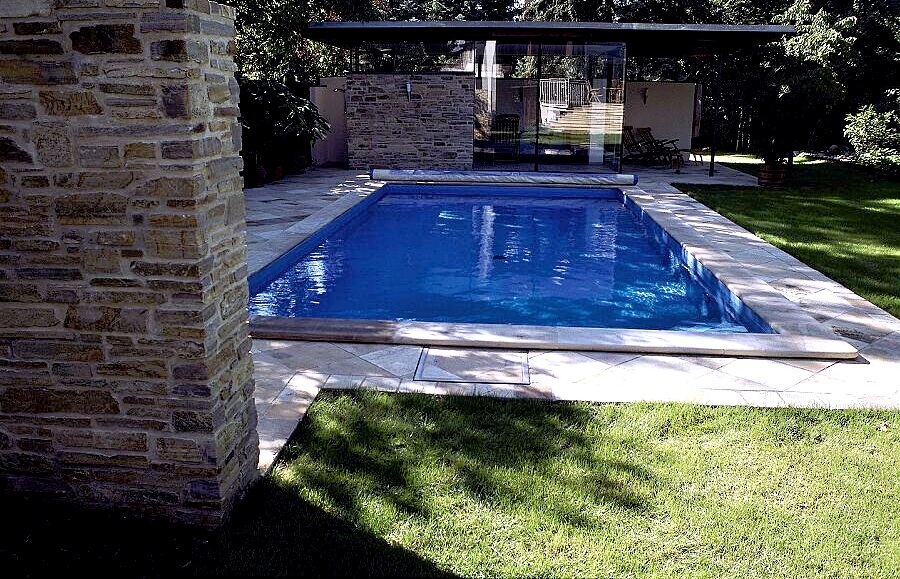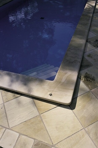 Bazény: Obdobně jako u schodiště můžeme řešit okolní plochy kolem bazénu. K dlažbě jsou dodávány i bazénové lemy a rohové prvky lemů. Ukončení hrany - zákazník si může zvolit z nabízených variant.