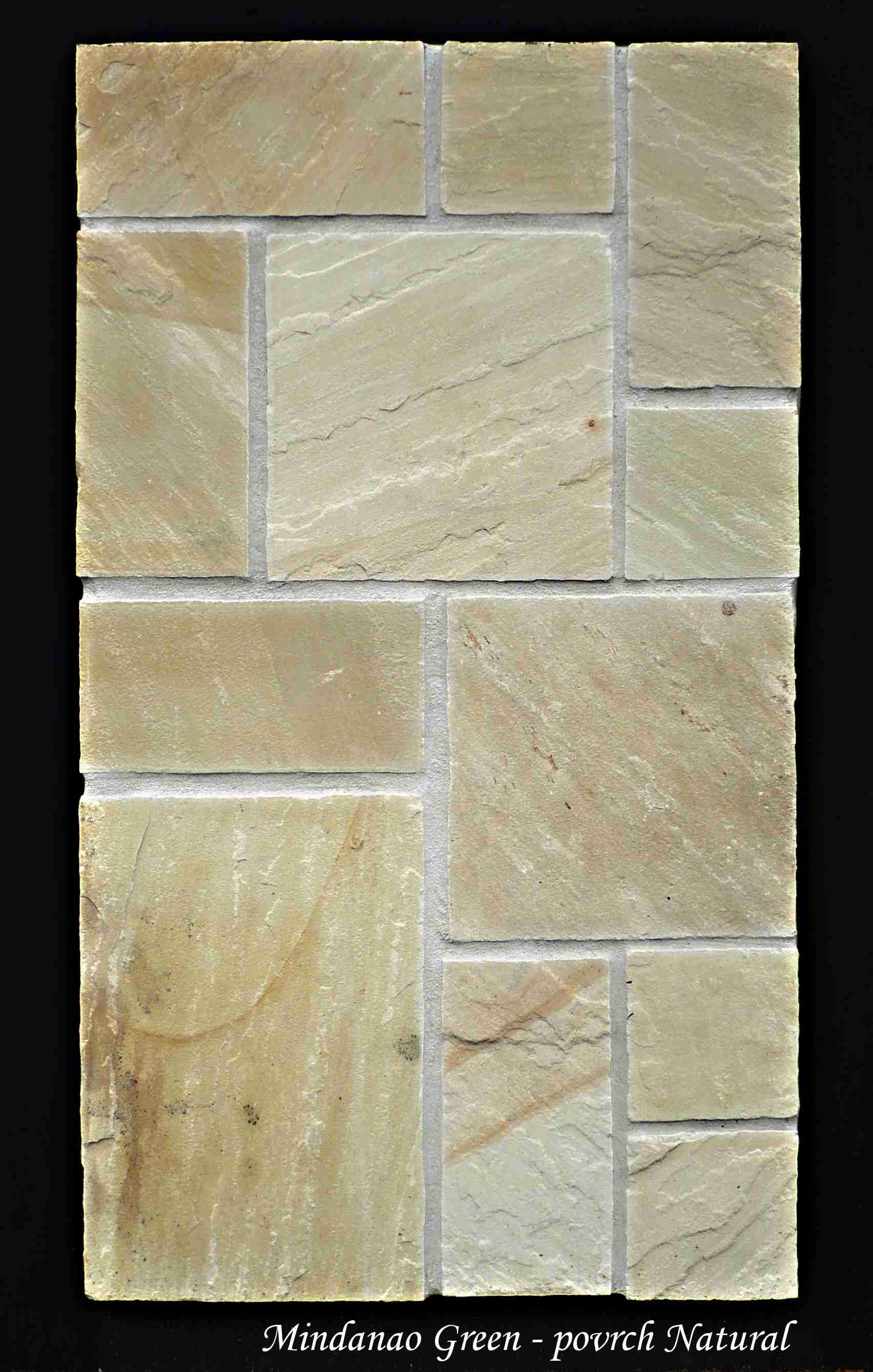 Mindanao Green - přírodní pískovec s vynikajícími mechanickými vlastnostmi. Jedná se o vrstevnatý materiál - sedimentární horninu. Dokonale vyhovuje těžkým klimatickým podmínkám tj. odolný mrazu (povětrnostním vlivům) a snese mnohatunové zatížení. Jelikož je minimálně nasákavý, dobře se udržuje a není zapotřebí dodatečných ochranných prostředků (penetrací). Jeho decentní barevné odstíny dokonale evokují pocit pohody a vytváří velmi výrazný přírodní doplněk moderních obydlí a zahrad. Lze ho prakticky kombinovat s jakýmkoliv materiálem, ať se dřevem nebo kovem. Barevnost materiálu - od světle hnědé a béžové s výraznou kresbou tmavě hnědých žil po lehký nádech světle zelené a žluté.